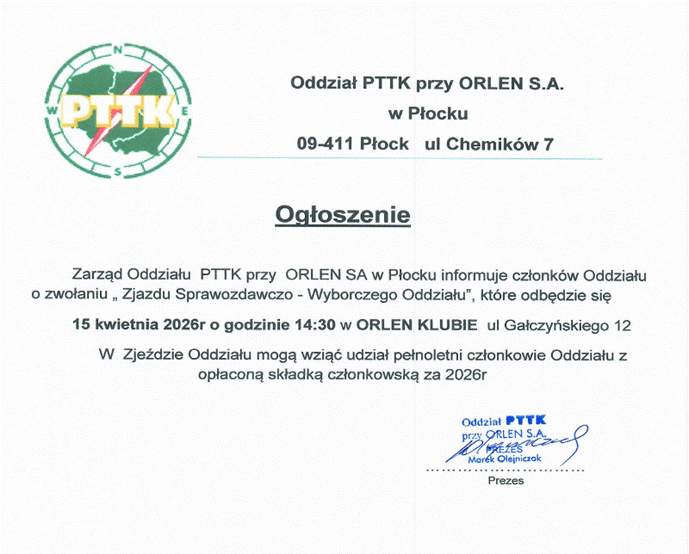 Wydarzenia - Informacje Oddziału PTTK przy ORLEN SA w Płocku